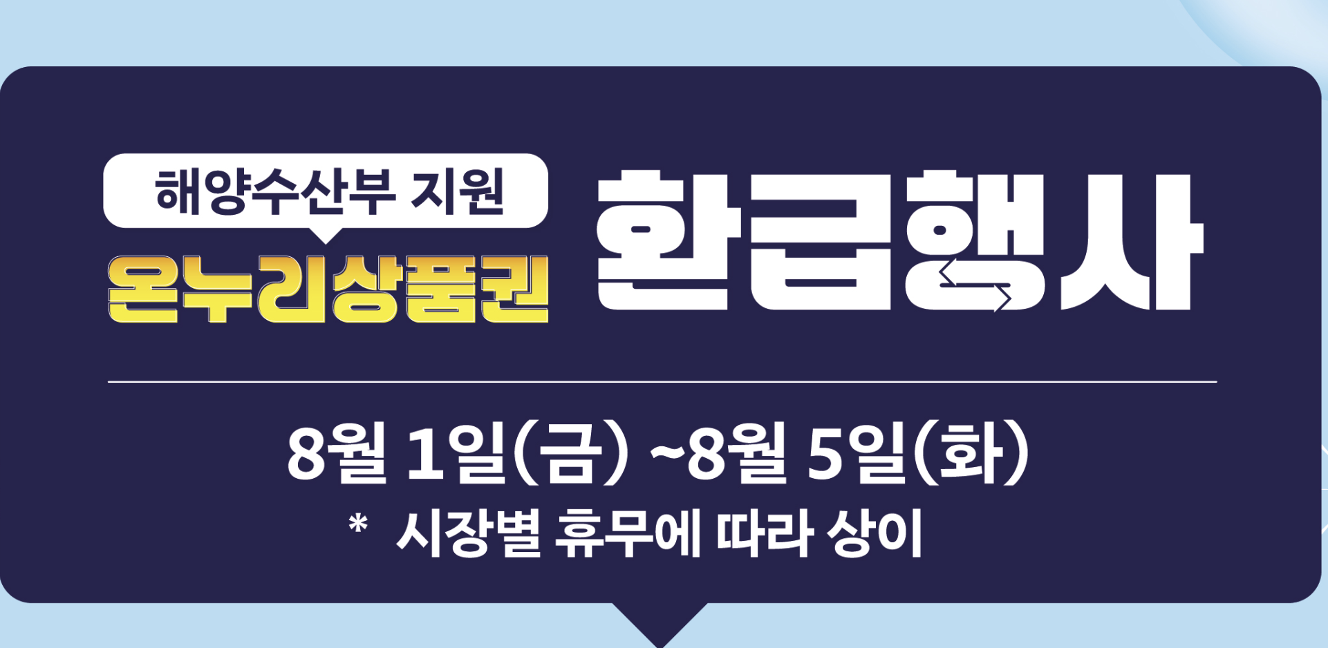 대한민국 수산대전에서 2025년 8월 1일(금)부터 5일(화)까지 단 5일간, 전통시장에서 국산 수산물을 구매하신 분들께 온누리상품권을 현장 환급해 드립니다.